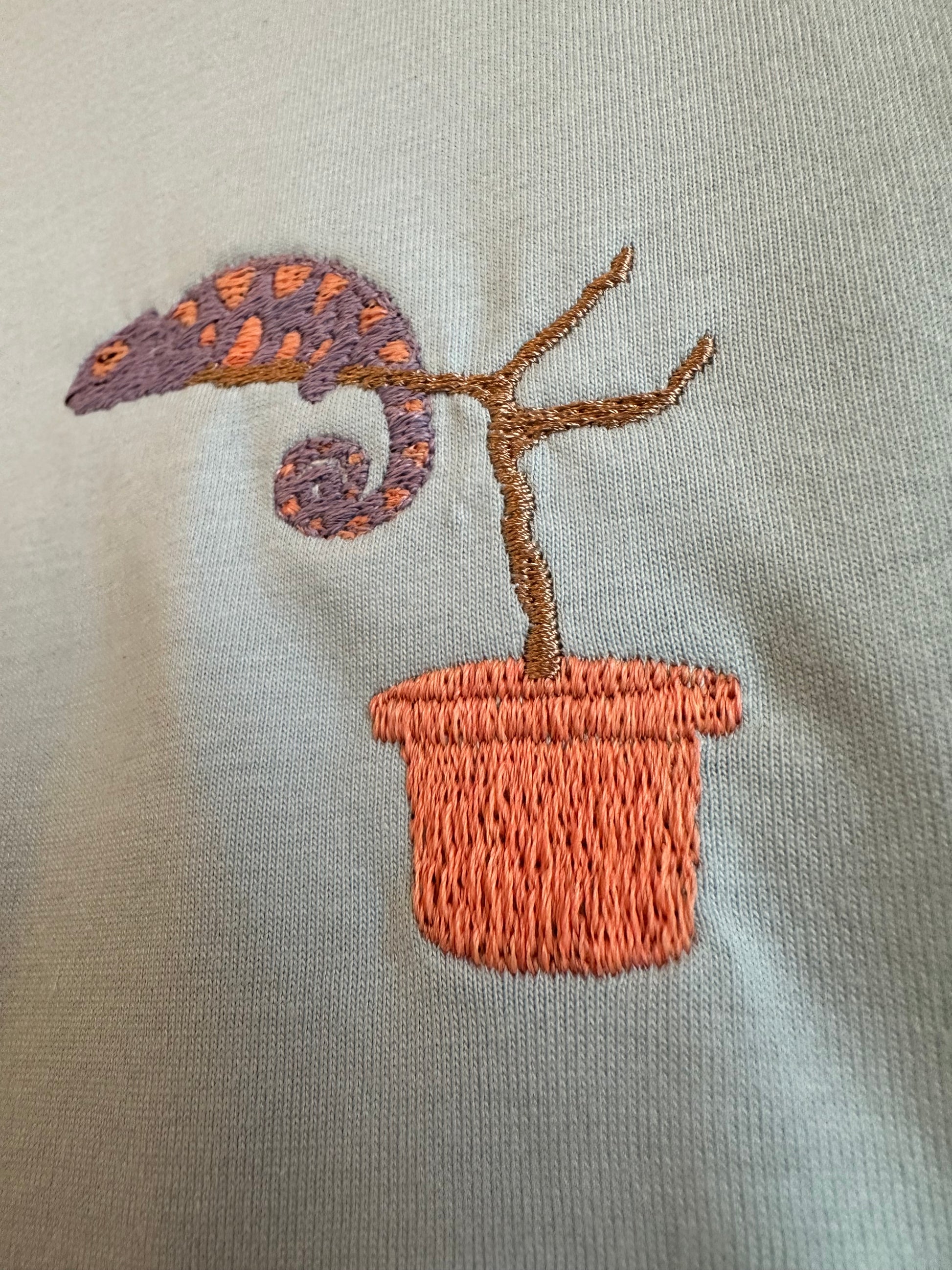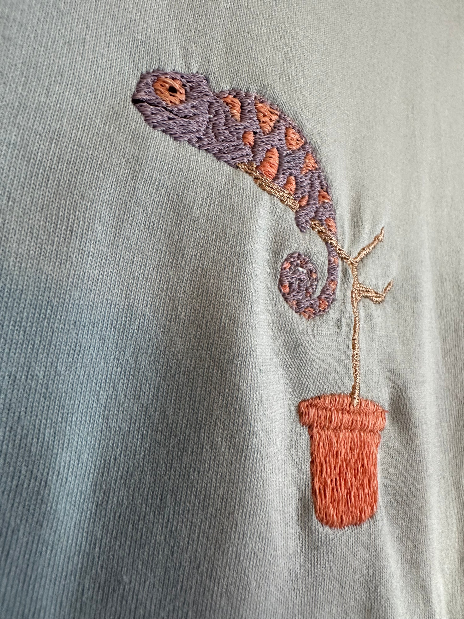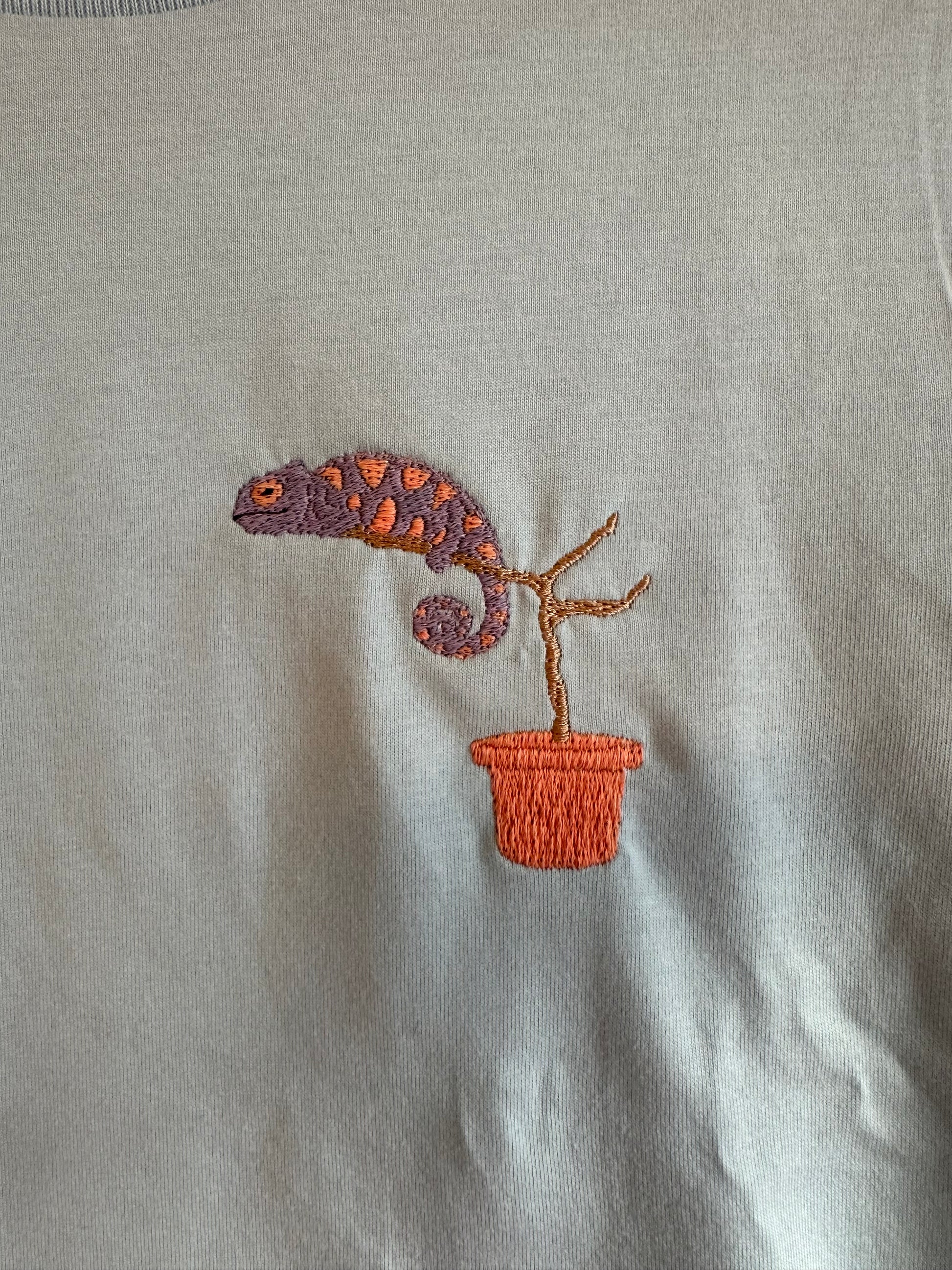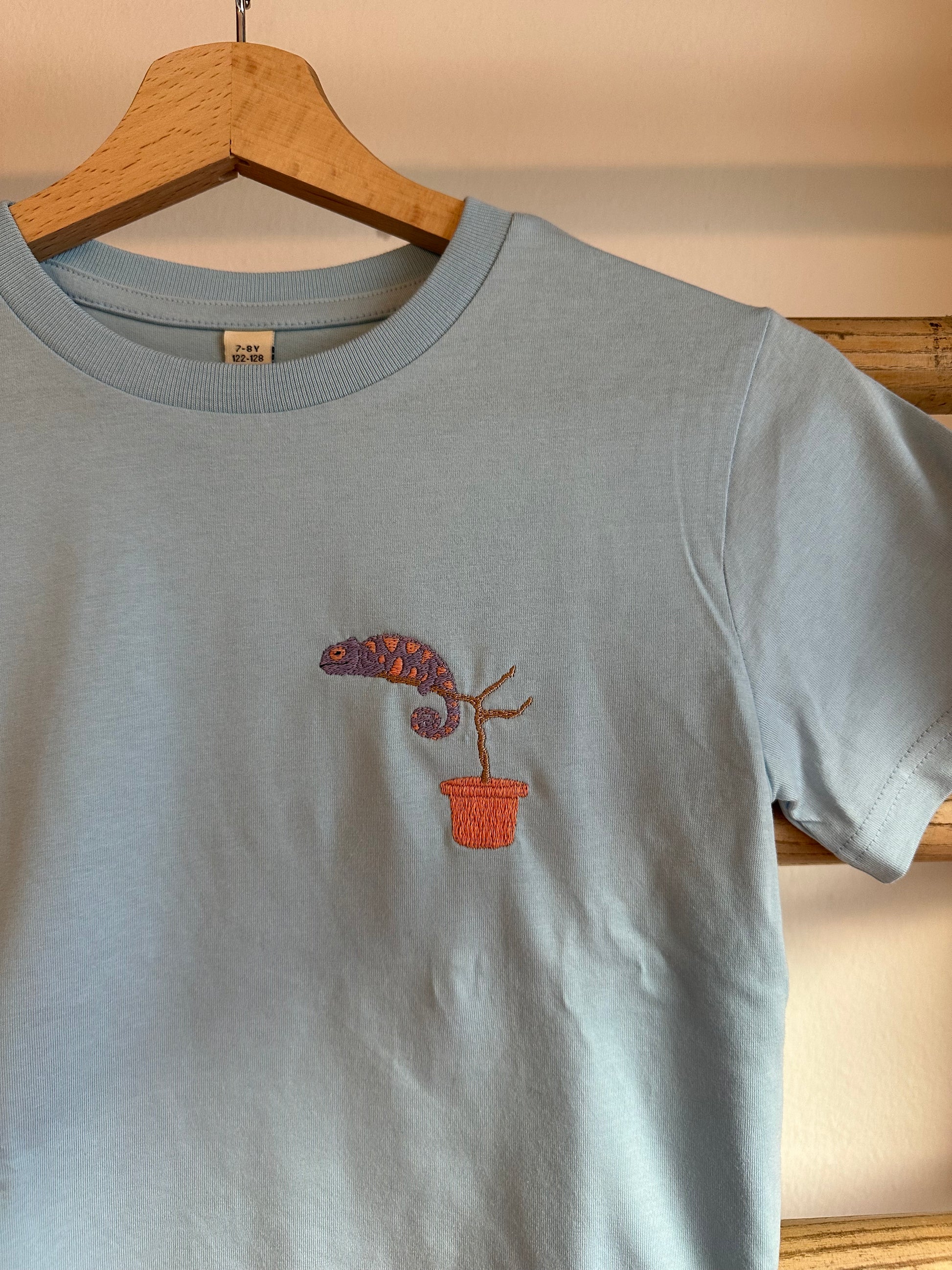T-Shirt Unisex Bio-Baumwolle bestickt mit Chamäleon (farbwechselndes Garn, interaktives Shirt)