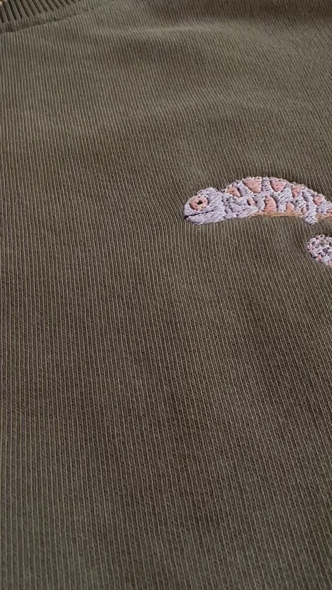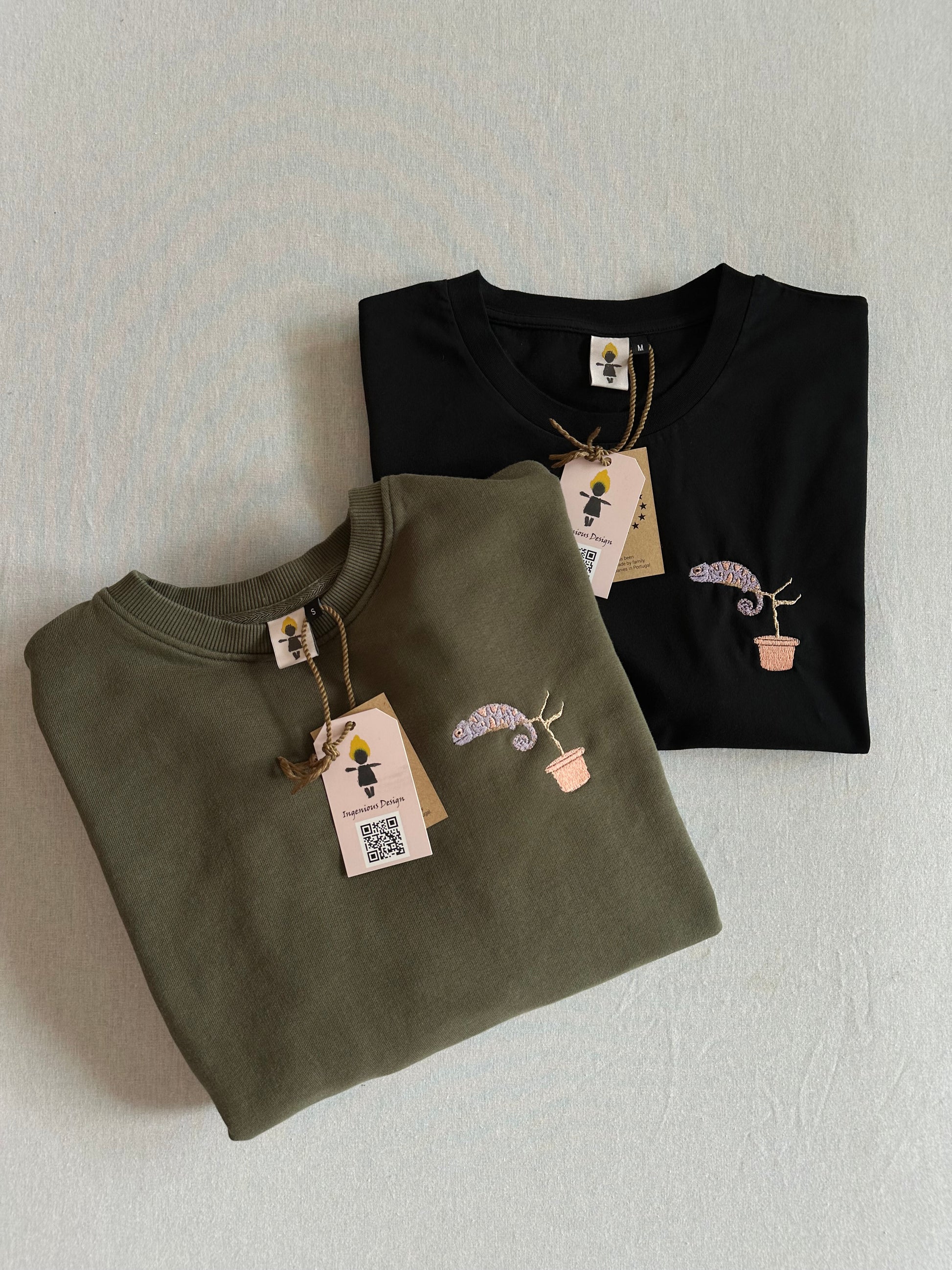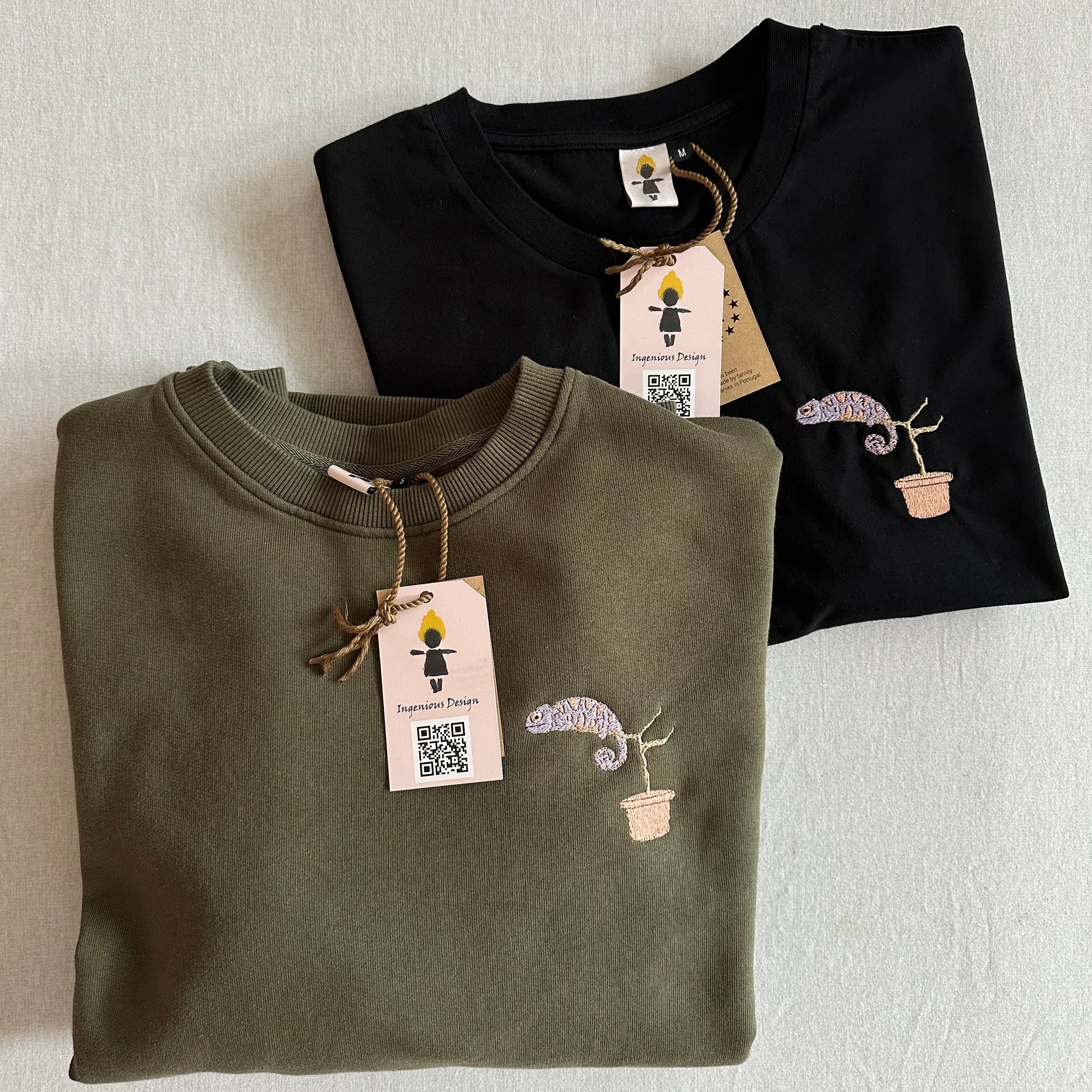Pullover T-Shirt Unisex Bio-Baumwolle bestickt mit Chamäleon (farbwechselndes Garn, interaktives Shirt