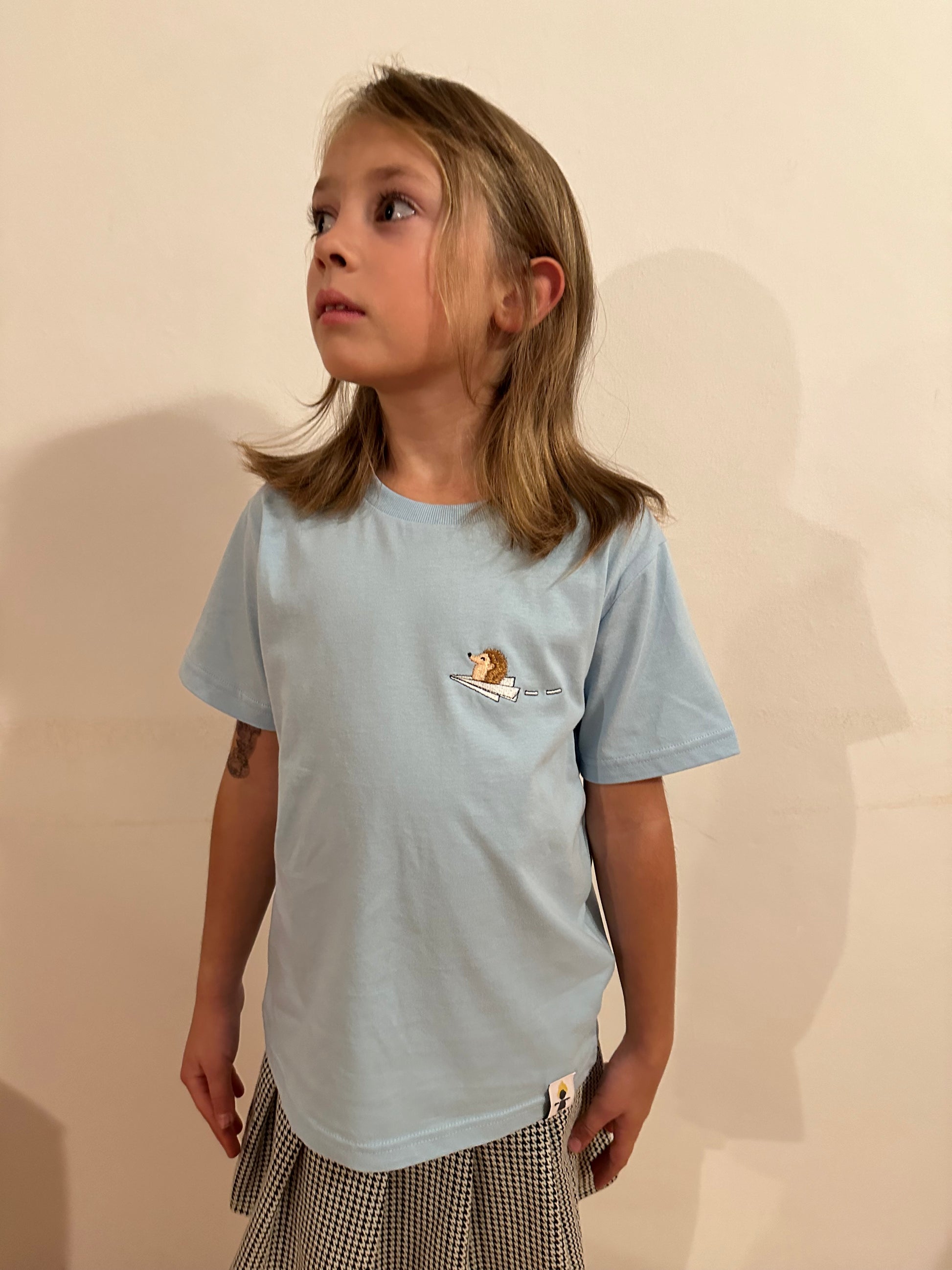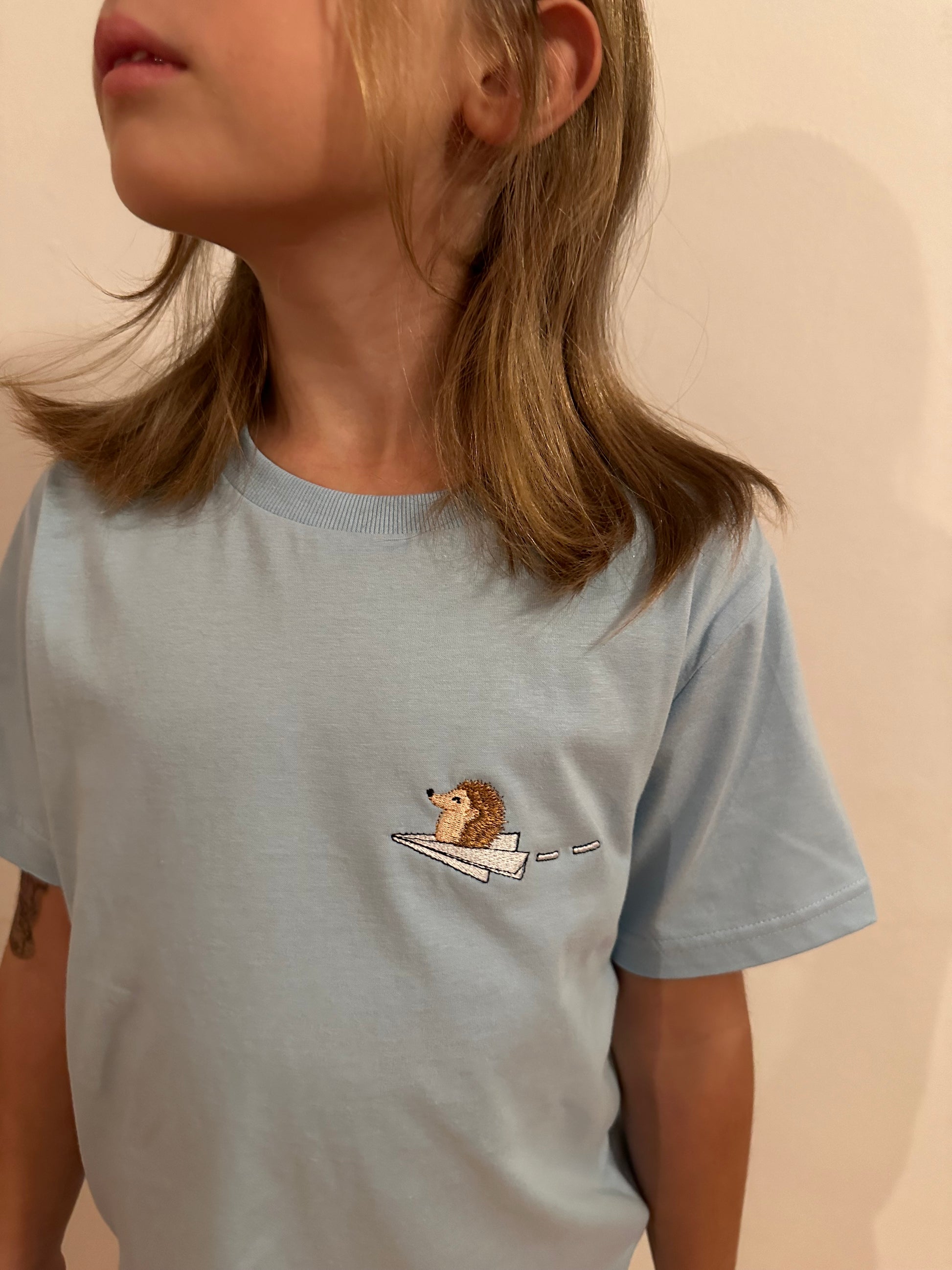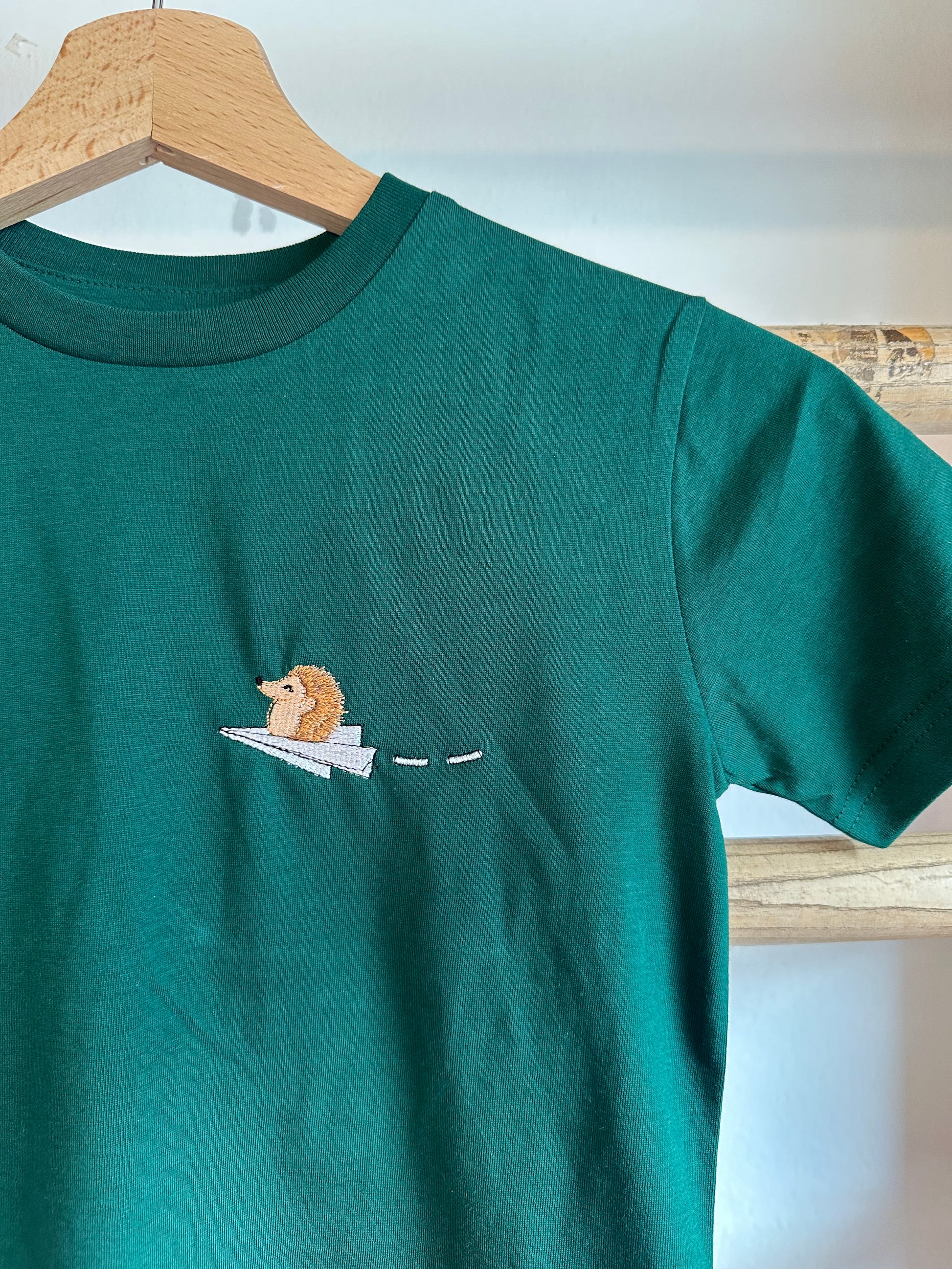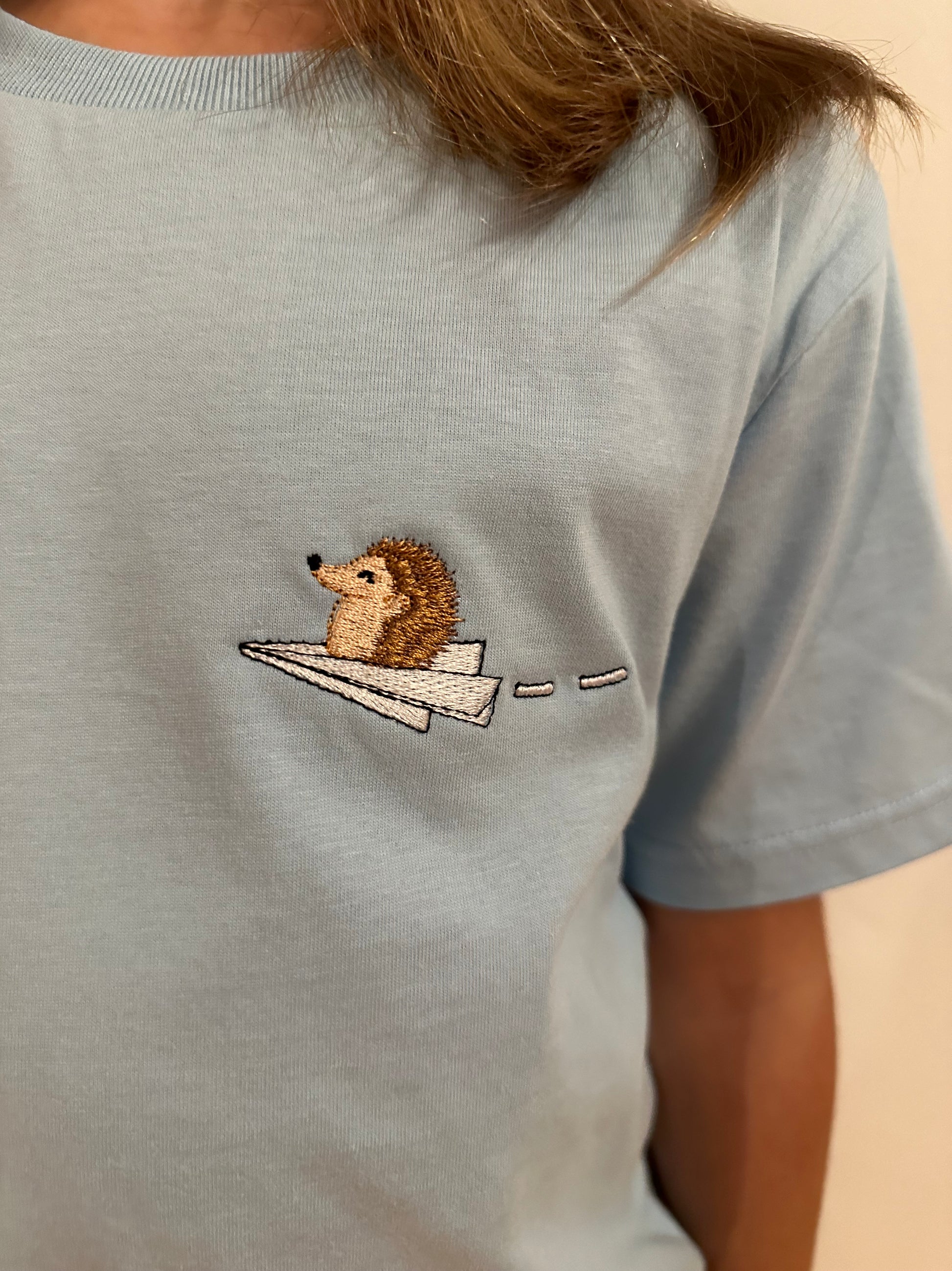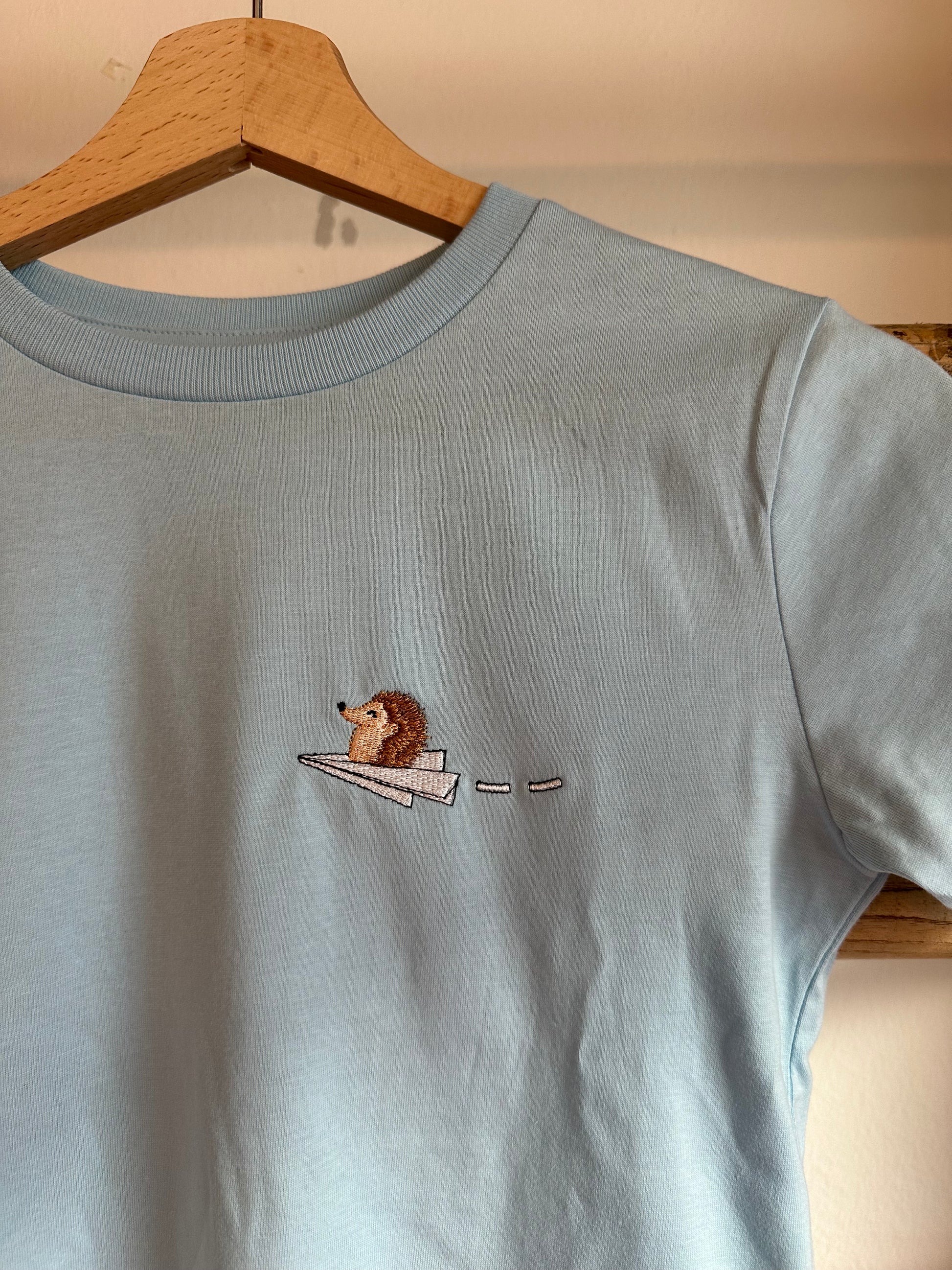 T-Shirt Unisex Bio-Baumwolle bestickt mit Igel auf Papierflieger