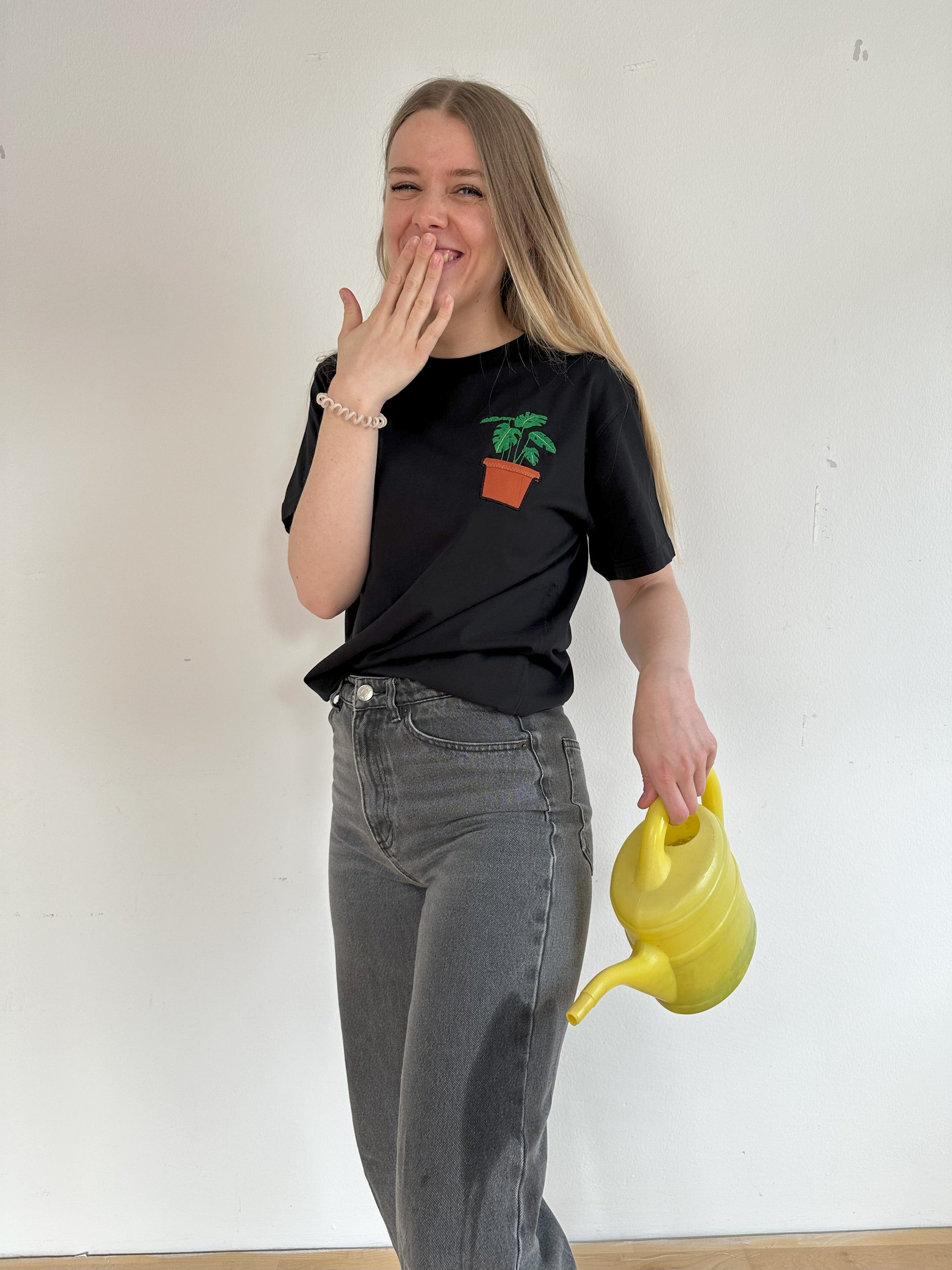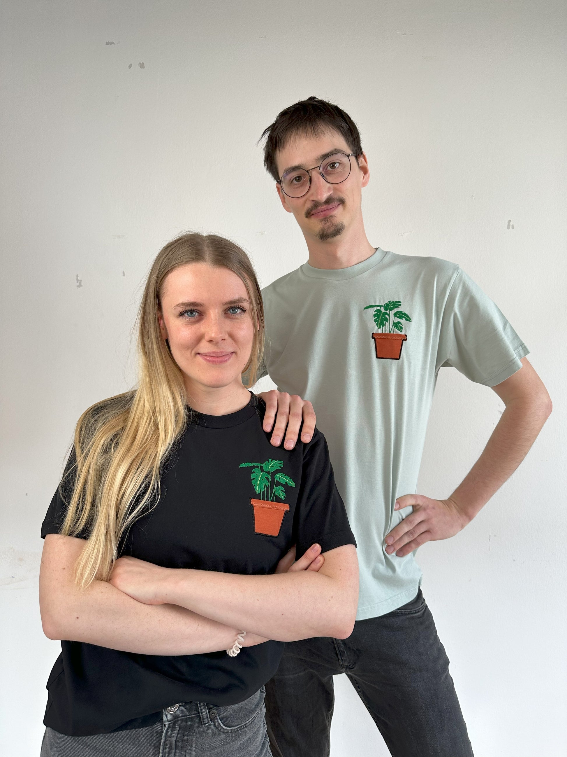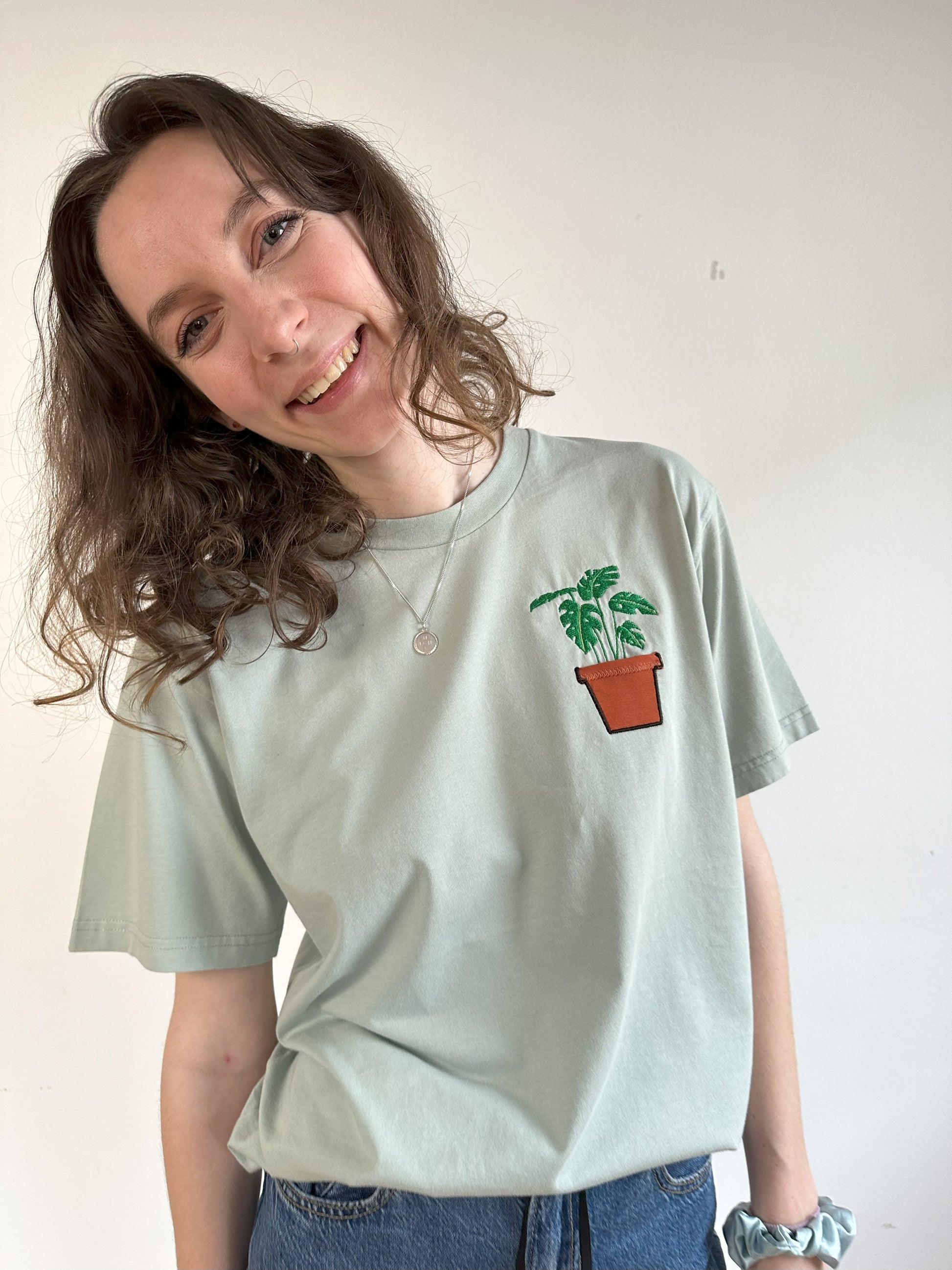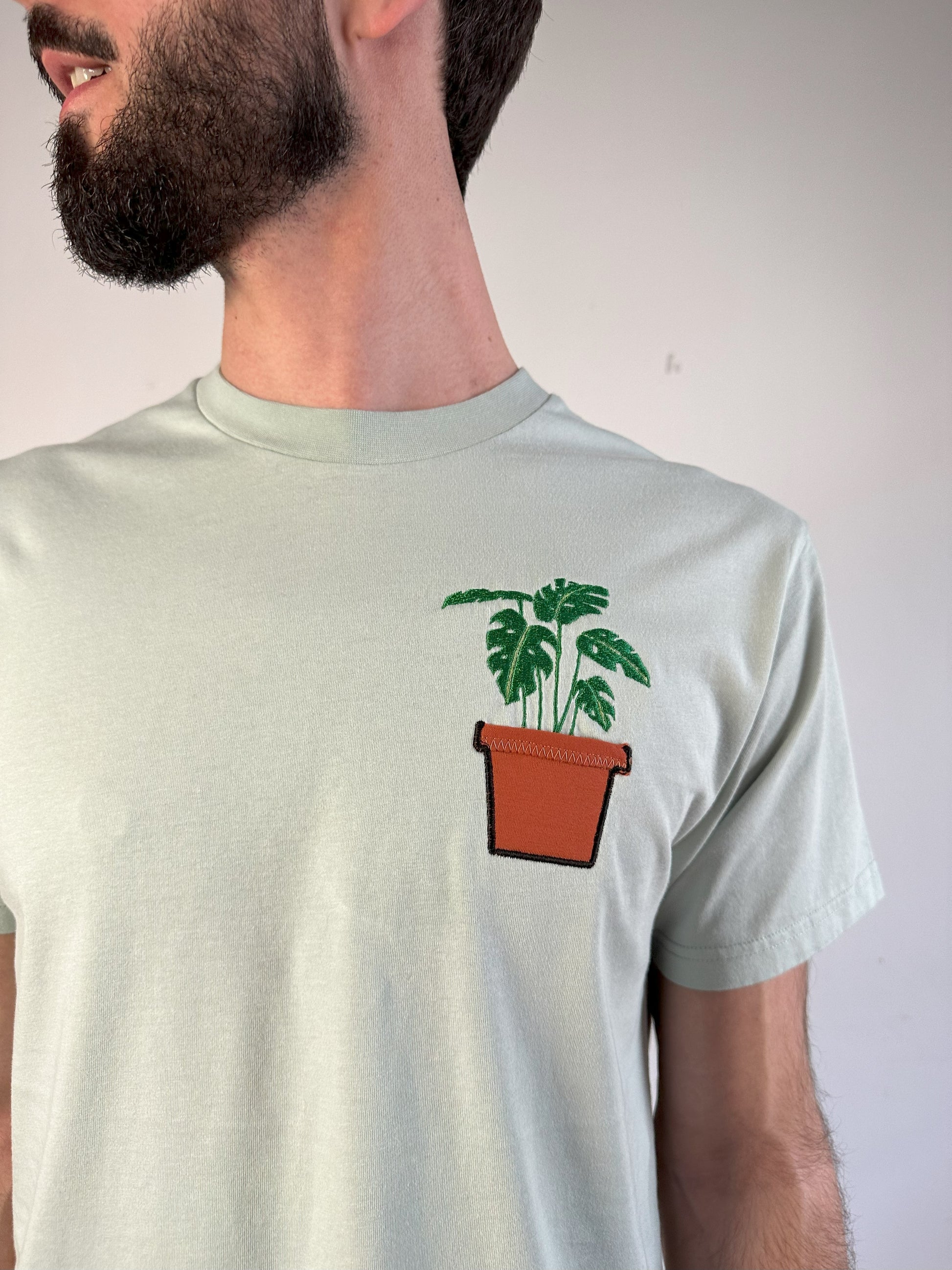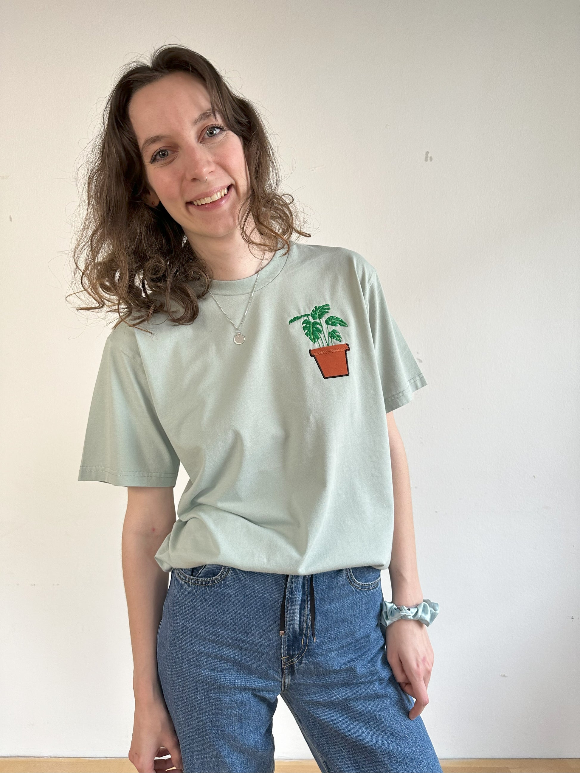 T-Shirt Unisex Bio-Baumwolle bestickt mit Monstera-Pflanze im Topf